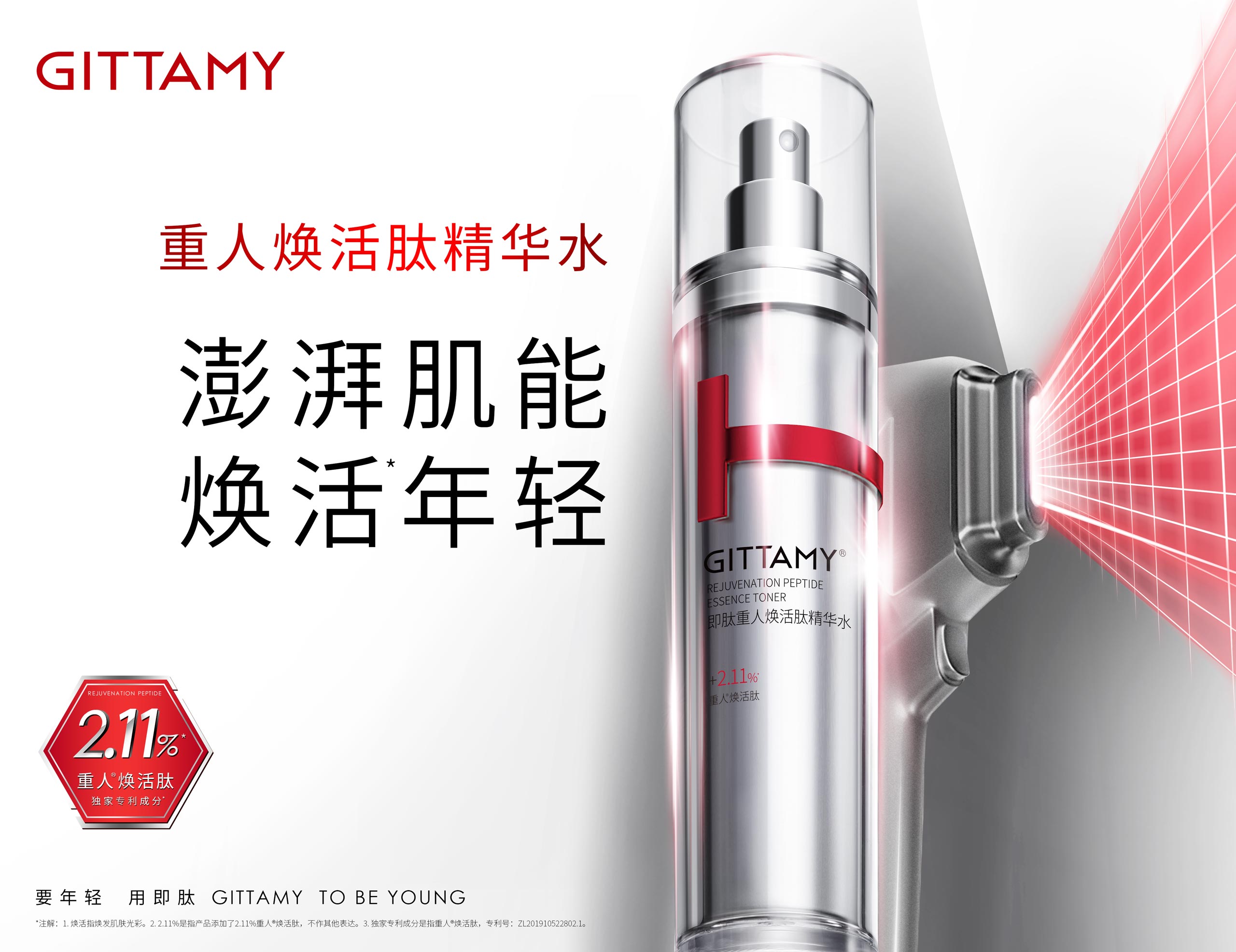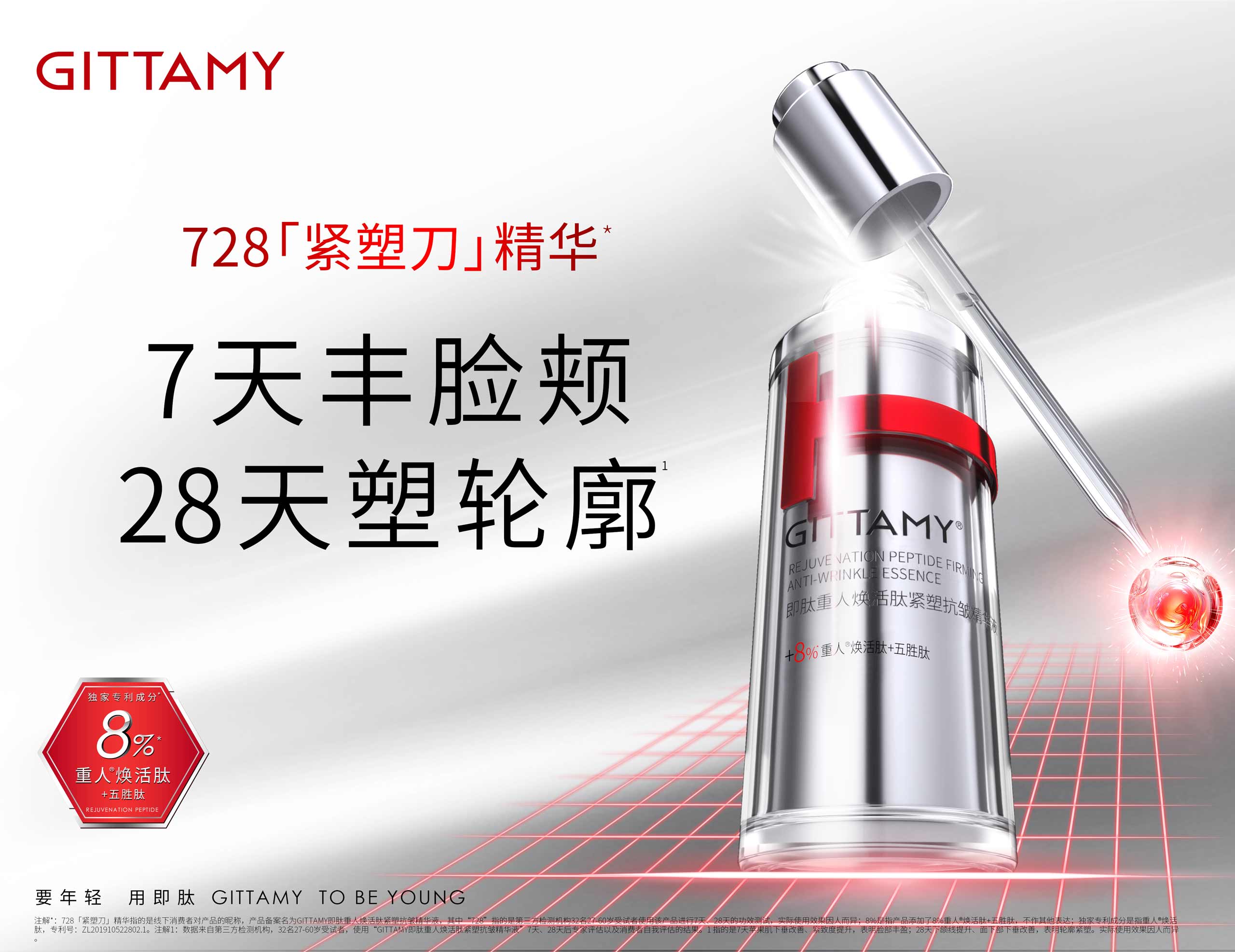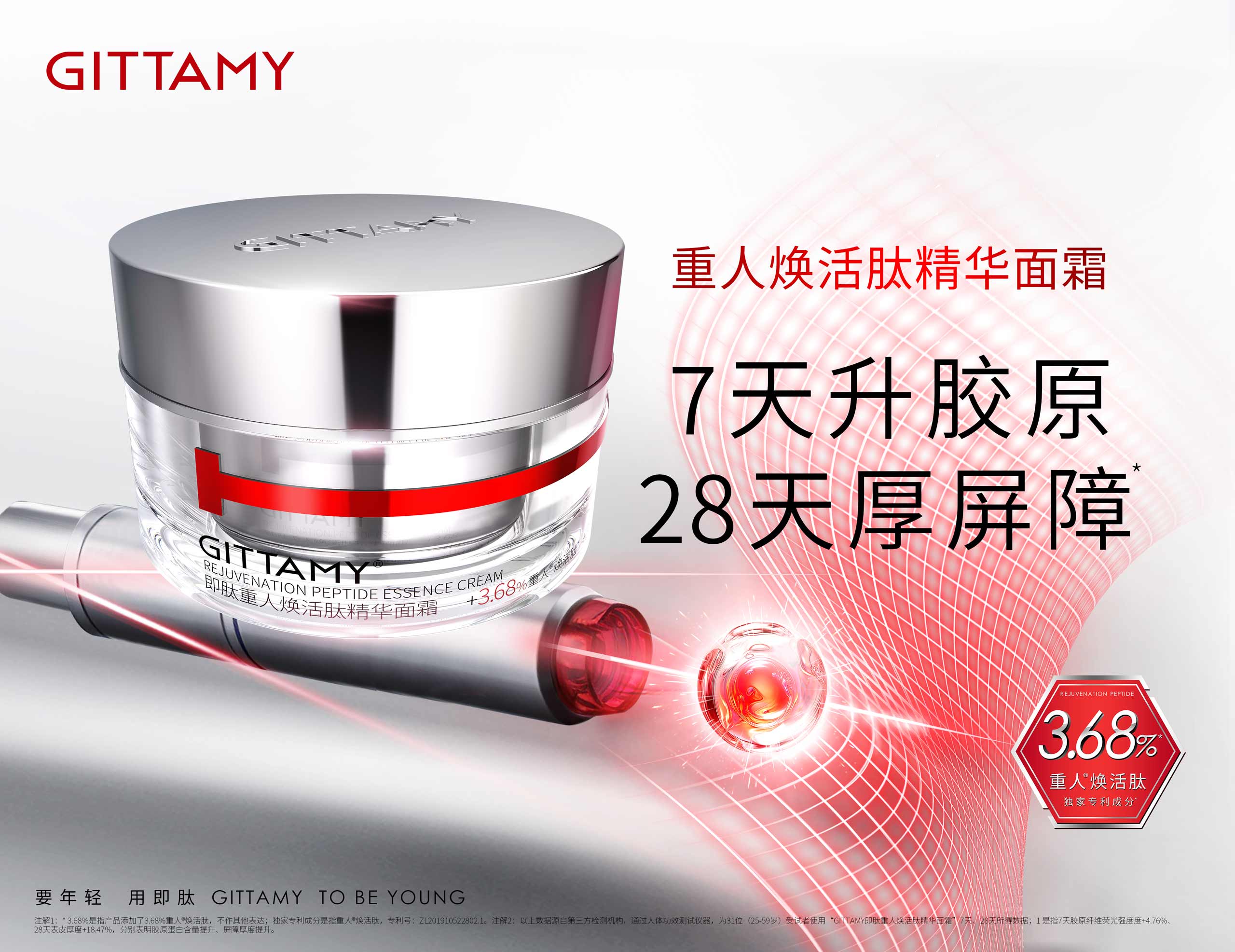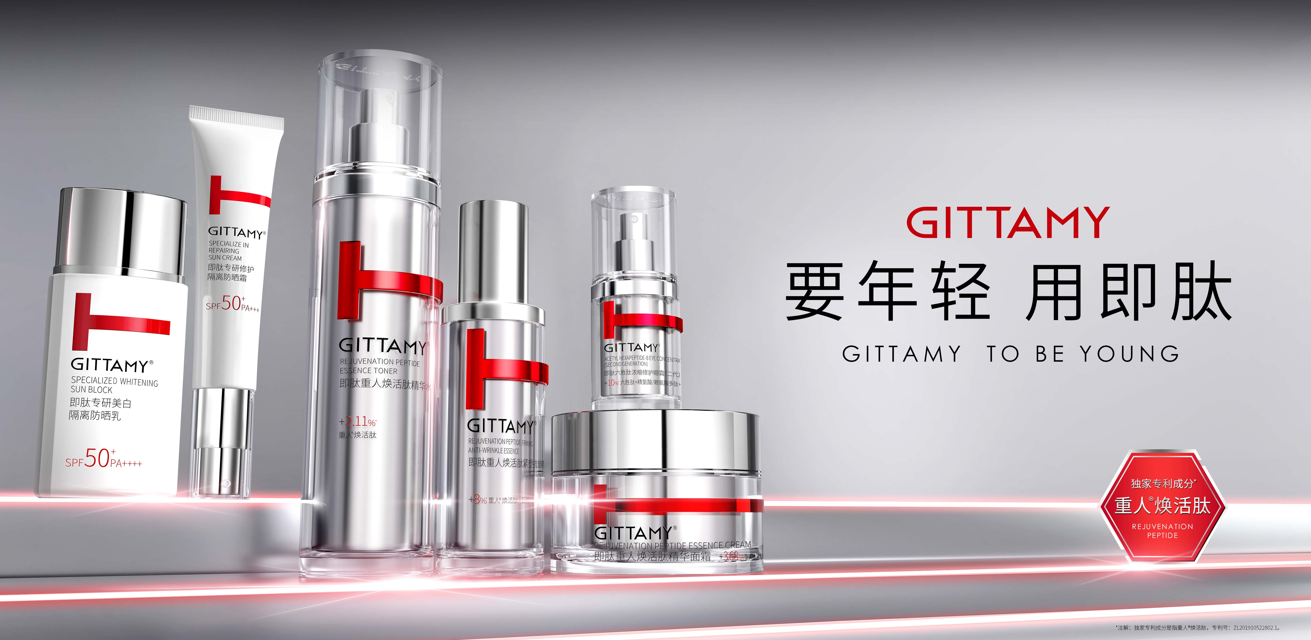 GITTAMY即肽,是一個能讓女性打破年齡界限,探尋年輕密碼的多肽科技抗皺品牌。2018年,即肽科技抗皺中心致力于破譯自然衰老定律,聯合全球知名專家與國家三甲醫院,開展多肽配方研發與功效測試。通過人體同源多肽提升皮膚的自我修護功能,讓皮膚從根源上煥發青春活力。GITTAMY即肽運用多肽科技,專研出重人?煥活肽*等多個品牌專利成分,令肌膚由內而外重啟年輕態。